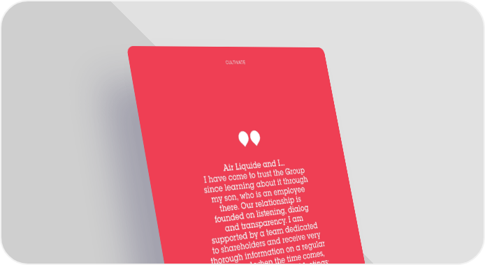 CULTIVATE Air Liquide and I... I have come to trust the Group since learning about it through my son, who is an employee there. Our relationship is founded on listening, dialog and transparency. I am supported by a team dedicated to shareholders and receive very thorough information on a regular basis. And when the time comes, I vote in Annual General Meetings; my voice counts, and that means a lot to me! Claudine, 63 - Shareholder who knows how to speak up 47
