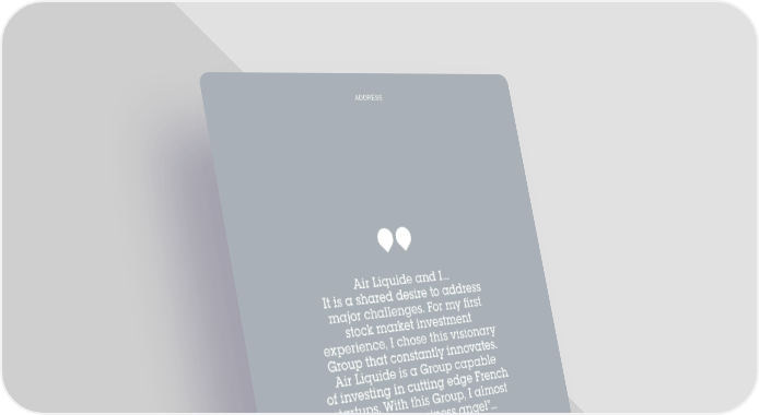 ADDRESS Air Liquide and I... It is a shared desire to address major challenges. For my first stock market investment experience, I chose this visionary Group that constantly innovates. Air Liquide is a Group capable of investing in cutting edge French startups. With this Group, I almost feel like a “business angel”... but in a 115-year-old startup! Léa, 29 - Budding shareholder who wants to broaden her horizons 19