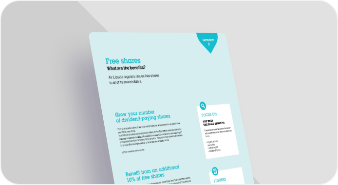 FACTSHEET FACTSHEET 1 2 Stock orders Free shares What type of stock order should I choose?What are the benefits? The stock market is a regulated market that brings together companies Air Liquide regularly issues free shares with funding requirements and investors, including individual investors. to all of its shareholders. Shares are bought or sold through a stock order. Understanding the stock marketGrow your number FIGURES of dividend-paying shares FOCUS ON SHARE ID SHEET For all shareholders, free share attributions enable you to expand your YOU KEEP portfolio over time. THE SAME BENEFITS Air Liquide share as at In addition to passing on approximately 50% of profits to shareholders by December 31, 2017 (a) paying dividends, Air Liquide distributes a portion of its retained earnings Free shares have the same character- Provides informationFinance Continuous trading on EURONEXT to shareholders in the form of free shares. These are free shares attributed istics as the shares they are derived Vote at the AnnualParis (COMPARTMENT A)in proportion to the number of shares you already hold. from: Pays a dividend General MeetingValue Code: (a) Past undistributed net profits. • loyalty bonus ISIN FR0000120073 • seniority Par value: €5.50 • voting rights INVESTORSNumber of shares: • dividend rights 428,397,550 shares Closing price: €105.05Benefit from an additional Market capitalization: €45bn 10% of free shares Weighting in the CAC 40 index: Share trading3.87%If you hold your registered shares for more than two full calendar years, Weighting in the EURO STOXX 50 the loyalty bonus gives you a 10% increase in the number of free shares (b) INSTITUTIONALINDIVIDUALindex: 1.88%you will receive . FIGURES INVESTORSINVESTORSFor example, in the attribution in 2017, one free share was given for every 10 shares held, each shareholder who owned 100 shares received REGULAR 10 new shares. Shareholders eligible for the loyalty bonus received ATTRIBUTION an additional free share. Free shares have already been distri- (b) In accordance with Air Liquide’s articles of association. buted 29 times by the Group. The last Choosing the right stock orderPLUS attribution took place in October 2017. To trade on the stock exchange, you can place an order with your regular financial REDUCED BROKERAGE intermediary or directly with Air Liquide if you are a direct registered shareholder. RATE The most frequently used stock orders are as follows: Direct registered shareholders, when 1 “Limit price” order 2 “Best price” order 3 “Market price” orderplacing your orders online via your per- You set a maximum buy or You did not specify an exact There is no price limit on this (a) sonal online account , you have the minimum sell order (limit). price. The order will be exe-order. This order is given option to benefit from a reduced broker- The buy order is executed cuted at the best price avai-priority over all other types age rate of 0.10% before tax instead of only when the market price is lable when it reaches the of orders. It is fully executed.0.18% before tax for purchases paid in lower than or equal to this limit market, for both buy and sell (b)GOOD TO KNOW full by SEPA automatic debit or by bank and the sell order when the orders. The order may be par-(c) card , as well as for sales. Fractional rights must be included in your total sales when paying your capital gains tax. The market price is higher than or tially executed if the quantity equal to this limit. The order of negotiable shares on the (a) Subject to having signed an account amounts received are taxable from the first euro. They are included on your Tax Reporting may be partially executed if the market is not available at this agreement. Only applicable to accounts with full ownership. Form (IFU). They are not subject to a tax deduction relating to their seniority (see factsheet 3). quantity of negotiable shares best price.(b) Only if the account is domiciled on the market is not available in the SEPA zone. Do not forget to include them on your tax return. (c) For purchases below €3,000. at the set limit price. 30 31