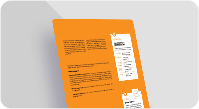 FACTSHEET Passing on 11 shares web conference Passing on shares and taxation Inheritance: the choice is yours! What solutions are available to pass on my shares? You can decide how your assets, including Air Liquide Shareholder Services for direct FIGURES your share portfolio, will be distributed registered shareholders, or your financial The elements of taxation in this factsheet apply to French residents for tax purposes. among your heirs. Upon your death, a institution for intermediary registered TAX EXEMPTION declaration signed by your notary stating shareholders and bearer shareholders, FOR DONATIONS Passing on your shares in advance allows you to benefit from an advantageous tax your marital status, the names of all benefi- will execute all instructions given by your framework, encourages your loved ones to save and educates them about the stock ciaries and the number of shares attributed notary or the person managing your estate. Every 15 years you are able to make to each beneficiary is sufficient to distribute a tax exempt donation for up to: market. You thereby also share your commitment to the Air Liquide Group. a portfolio. €100,000 f or each child and from each parent Seek advice €80,724 f or a spouse or civil partner 4 ways of passing on shares Your notary can advise you on personalized solutions for passing on marketable shares €31,865 f or each grandchild as part of a gift or inheritance and will write the deeds. €15,932 for each brother Some examples: and sister 1 Simple gifts 2 Shared gifts Inter-vivos distribution donations allow you to pass on your shares while continuing to €7,967 f or each nephew receive the dividends, i.e. retain the usufruct. The usufruct can be full or partial. Donation or niece PrinciplePrinciple rights are reduced as they are based on the bare ownership value of the donation. On the €5,310 f or each great- Anticipated allocation of your shares Anticipated total or partial allocation death of the grantor, the bare owners recover the usufruct and therefore full ownership of grandchild to the beneficiary of your choiceof your shares to your children the shares. Dividends from free shares attributed after the donation are also paid to the beneficial owner. OverviewOverview • Tax advantages• Donation only to children The ban on giving up your shares prevents the sale of the shares or their donation • Notarial deed and declaration of the gift carried out by • Tax advantages for a set period. a notary• Lower inheritance taxes The right of return allows the grantor to take possession of the shares again if the • May be added to the grantor’s estate• Notarial deed and declaration of the gift carried out by the notarygrantee dies first. • Purchase price valued at the average share price on the day • Not added to the grantor’s estate of the gift or at the closing price of the previous trading day. • Purchase price valued at the average share price on the day Do not forget to send a copy of the notarial deed to your Contactez-nous Rencontrez-nous Écrivez-nous Espace actionnaires Service actionnaires of the gift or at the closing price of the previous trading day 0 800 166 179 Ouvert du lundi au vendredi 75, quai d’Orsay de 9 heures à 18 heures 751 Paris ede 07 ou + 33 (0)1 57 05 02 26 75, quai d’Orsay ou directeent sur le site account manager depuis l’international 75007 Paris http contactactionnairesairliquideco • Loyalty bonus maintained if the gift is made to a spouse • Loyalty bonus maintained PLUS or relative entitled to inherit A LASTING GIFT Parents, grandparents, give shares to your children and grandchildren! Shareholder Services sends a gift 3 Hand-to-hand gifts 4 Customary gifts envelope directly to your loved ones as part of your gift of shares when you PrinciplePrinciple make a donation. Facilitated passing on of your shares A present given on a special occasion to your loved ones(wedding, birthday, Christmas, etc.) OverviewOverview • Tax advantages• Must represent a relatively small share of the grantor’s assets • Written agreement from both parties. In order to value the shares • Does not need to be declared to the fiscal authorities GOOD TO KNOW passed on, the grantee’s local tax authority must be notified • Not added to the grantor’s estate of the gift within one month, using French tax form 2735• Purchase price of zero: when these shares are sold, the LOYALTY BONUS • Hand-to-hand gifts have to be added to the grantor’s estate capital gain realized will be equal to the total net sale amount In the case of passing on shares or gifts to a spouse or a relative entitled to inherit, any loyalty and included in the allocation of the grantor’s assets• Loyalty bonus maintained if the gift is made to a spouse or • Purchase price valued at the average share price on the day relative entitled to inherit bonus attached to Air Liquide shares is retained. of the tax declaration or, if this is higher, at the average price on DIRECT REGISTERED SHAREHOLDERS the day of the gift. Do not forget to send a copy of declaration 2735 to your account manager You can download “Hand-to-hand gifts” and “Customary gifts” forms on the airliquide.com website, • Loyalty bonus maintained if the gift is made to a spouse in Shareholders / Media Library / Forms. For gifts completed before a notary, do not forget to send or relative entitled to inherit the notarized documents to Air Liquide’s Shareholder Services. 64 65