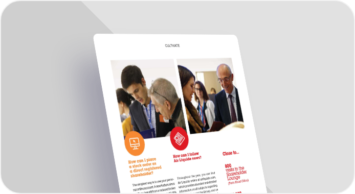 CULTIVATE CULTIVATE I have a question... Shareholder Services and its 28 advisors are available to answer your questions every day. Here are five frequently asked questions. What are the I am lost on filling I don’t live in the Paris How can I place How can I follow advantages of being out my tax declaration region... Who can I meet a stock order as Air Liquide news? Close to... a registered form... Can someone who can talk to me about a direct registered shareholder?help me?Air Liquide and its shares?shareholder? 800 First and foremost, you are entitled to a If you are a direct registered share- Benoît Potier travels to meet individual The simplest way is to use your perso-Throughout the year, you can find visits to the loyalty bonus after holding your shares holder, the “My document library” section shareholders in two different regional nal online account. A new feature since Air Liquide online at airliquide.com, Shareholder in registered form for two full calendar in your personal online account contains cities every year. At these meetings, he 2017, you benefit from a reduced broker which provides abundant and detailed Lounge years, which rewards this loyalty to the all the documents you need (Tax Form, presents the Group’s strategy, then par-fee of 0.10% before tax instead of 0.18% information on all subjects regarding (Paris Head Office) Group through a +10% increase in divi- Market Statement, etc.) in addition to tax ticipates in a round table with Air Liquide before tax, with no minimum (see fact-shareholding and the Group, and on dends and free shares during free share simulators available for everyone on the experts on a given theme. In 2018, Reims sheet 10). Otherwise, you can contact social networks–Twitter, Facebook attributions (see factsheet 2). You also Group’s website. Beyond that, Air Liquide and Cannes will be the host cities. Addi- dedicated “stock order” experts available and LinkedIn–where Air Liquide posts 50,000 have a totally secure personal online provides factsheets to all shareholders tionally, shareholder meetings conducted in person in the Shareholder Lounge at informative communications on a calls account at your disposal at any time. and organizes two web conferences per by Patrick Renard, Director of Share- Head Office, on the toll-free number, or regular basis. In addition, Shareholder This enables you to consult your port-(a) Services keeps you up-to-date with year on taxes and inheritance. These holder Services, are held every year in six via email . folio and your eligibility for the loyalty educational meetings, including one Q&A to eight cities throughout France. On the regular emails. 92,000 bonus, request to receive Annual session, are organized by Air Liquide digital side, you can watch the Annual emails General Meeting invitations by email and experts, the notary group Monassier, as General Meeting live via webcast, which and mails vote on proposed resolutions. This ser-well as trade journalists. Lastly, in case of is accessible for the deaf and hearing (a) [email protected]. vice offers another advantage to direct difficulties, advisors from Shareholder impaired–and enhanced in 2017 with 2017 data. registered shareholders: for example, Services are at your service. Facebook Live for certain parts of the they can place stock orders 24/7, check event–or follow the Group’s Twitter feed. CALL USWRITE TO US account documents and validate their + 33 (0)1 57 05 02 26 Directly through the website requests for exemption from the advance contact.actionnaires.airliquide.com withholding on dividends online. Lastly, from outside France the dedicated team of advisors from or LOG ON Shareholder Services guarantees person- 0 800 166 179 to your personal account at alized and tailored support. airliquide.com/shareholders 56 57