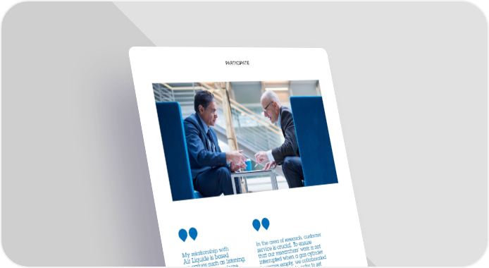 PARTICIPATE PARTICIPATE A customer-centric transformation Since the acquisition of Airgas, Air Liquide serves more than 3.5 million customers and patients around the world. Air Liquide’s strategy aims to constantly improve customer and patient satisfaction as well as provide brand new and efficient solutions to meet their needs. my customer week” enabled more than concrete and encourages all employees 4,000 employees to interact directly with to better integrate customer expecta- customers. Next, optimize each contact tions in their daily decisions. with our customers to simplify inter- My relationship with In the area of research, customer actions and make them smoother. Lastly, What are customers’ feedback?Air Liquide is based service is crucial. To ensure listen to our customers even more.Regardless of their satisfaction level, on values such as listening, that our researchers’ work is not they perceive this type of process assistance and a desire interrupted when a gas cylinder Audrey Eudeline, With the “Voice of Customer” in a very positive way. Asking for their to develop my skills becomes empty, we collaborated Director of “Customer Experience” program?opinion to identify areas for improvement, in technical matters. with Air Liquide in order to set at Air LiquideExactly. This program is based on a contacting them directly and quickly It’s important and reflects up a stock of cylinders directly digital solution that collects customer when a problem is identified and ensur- how Air Liquide values at our sites. Products are available testimonials, which are read and used ing it is solved–this is obviously a good its customers. It contributes immediately if the laboratories in real-time by our teams. Analyzing thing for them because this progress to building trust.run out, which truly is a customized Improving customer satisfaction, this information to better identify our demonstrates how important they Guillaume Penigaultresponse. what does that mean exactly?customers’ needs and expectations are to us.Head of Purchasing, Korian We want to be the leader in customer is important, but not new. However, Ludovic Dehri satisfaction in our market. A successful the immediate availability of individual What are the initial significant Head of Works, Maintenance and Logistics, customer experience means satisfying testimonies enables Air Liquide to impacts of this program?ESPCI Paris (École Supérieure de Physique the customer during every interaction manage each customer in a personalized Benelux has rolled this out as a pilot et de Chimie Industrielles de la ville de Paris) with Air Liquide (request for information, way. And this is new. program and is already seeing initial order, delivery, invoicing, after-sales results. Customer testimonials enabled service, etc.). To accomplish this, the How can we truly talk about them to identify areas for improvement, Group focuses on three areas. transformation?including, for example, transforming the First, increase attention to customers at This program, which has started being customer service center located in the all levels of the Company, not only within rolled out within the Group, enables Netherlands. An inspiring model for the the sales teams or customer relations employees to access every customer’s other subsidiaries that are currently teams: in Asia for instance, a “Meet opinion directly. This makes things very rolling out the program. 14 15