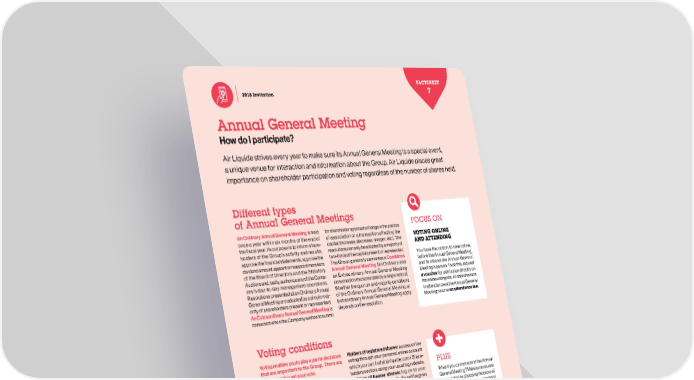 FACTSHEET 2017 highlights CULTIVATE 7 and 2018 edition 2018 Invitation Annual General Meeting The Annual General How do I participate? Air Liquide strives every year to make sure its Annual General Meeting is a special event, Meeting, a high point a unique venue for interaction and information about the Group. Air Liquide places great importance on shareholder participation and voting regardless of the number of shares held. for shareholder democracy Different types of Annual General Meetings FOCUS ON For this unique moment of dialog between Air Liquide An Ordinary Annual General Meeting is held for shareholder approval a change in the articles and its shareholders, the Group makes full use of digital once a year within six months of the end of of association or a transaction affecting the VOTING ONLINE the fiscal year. Its purpose is to inform share- capital (increase, decrease, merger, etc.). The AND ATTENDING technology to broadcast the Annual General Meeting holders of the Group’s activity and results, resolutions can only be adopted by a majority of approve the financial statements, approve the two-thirds of the capital present or represented. You have the option to vote online, to as many shareholders as possible before, during dividend amount, appoint or reappoint members The Group generally convenes a Combined before the Annual General Meeting, of the Board of Directors and the Statutory Annual General Meeting (an Ordinary and and to attend the Annual General and after the meeting. Immersion.Auditors and, lastly, authorize any of the Comp-an Extraordinary Annual General Meeting Meeting in person. To do this, request any’s day-to-day management operations. convened on the same date by a single notice). a voucher for admission directly on Resolutions presented at an Ordinary Annual Whether the quorum and majority conditions the online voting site. All shareholders General Meeting are adopted by a simple maj- of the Ordinary Annual General Meeting or in attendance at the Annual General ority of shareholders present or represented. Extraordinary Annual General Meeting apply Meeting receive an attendance fee. An Extraordinary Annual General Meeting is depends on the resolution. PREPAREEXTEND THE DIALOGconvened when the Company wishes to submit For the first time in 2017, a large survey After the Annual General Meeting is Lastly, discussions continue during was conducted before the Annual closed, a press release announces the the following weeks with two “post- General Meeting to 29,000 shareholders results of the vote on resolutions. At the Annual General Meeting” sessions held in Voting conditions who chose the electronic invitation. The same time, in order to better involve France, during which Benoît Potier meets Voting enables you to play a part in decisions Holders of registered shares: access online purpose was to collect their expectations shareholders who were not able to shareholders in different cities. that are important to the Group. There are voting through your personal online account for this meeting and their opinion on the attend, a selection of ten key moments of three ways to cast your vote.which you can find at airliquide.com / Share- PLUS topics proposed. Thanks to more than the meeting are published on YouTube. holders section, using your usual login details. 5,000 responses, the ambition to build Before the Annual General MeetingHolders of bearer shares: log on to your What if you cannot attend the Annual 1 Online financial institution’s website. You will be given General Meeting? Make sure you are the Annual General Meeting program The vote by Internet is a simple and secure the option of voting if your financial institution represented by choosing the proxy of together with shareholders was achie-solution for registered and bearer shareholders has signed up for the electronic voting system.your choice. Plan ahead: no proxies or ved. In 2018, the Group is repeating this in France and overseas alike. You can:Once you have voted, you can print out a state-power of attorneys can be accepted • access online all the documentation relating ment proving that your vote has been registered. on the day of the meeting. process. to your vote (Invitation to the Annual General Meeting, Reference Document, etc.); 2 By mail FOLLOW LIVE OR LATER • vote on the resolutions; By completing and sending in your voting form • appoint the Chairman or a third party as your received along with the invitation to the Annual On the day of the meeting, live coverage proxy; General Meeting. via the Group’s Facebook page offers • apply for an admission card to the Annual shareholders a preview of the special General Meeting. At the Annual General Meeting 3 Vote during the meeting exhibit two hours before the meeting Using your electronic voting device provided begins. on arrival. Then, when the Annual General Mee- ting starts, the event is live tweeted GOOD TO KNOW and broadcasted at airliquide.com in a format accessible to those who are The event is broadcast live on airliquide.com, in both French and English, then made available deaf or hearing impaired. Lastly, you can as a webcast. Following every Annual General Meeting, Benoît Potier travels to two cities in relive the event through a webcast in France to present the Group’s results and outlook. In 2018, he will be meeting shareholders French and English after the event.in Reims (on May 22) and Cannes (on May 31). 50 5151
