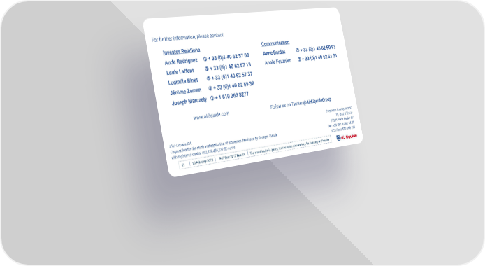 For further information, please contact: Investor Relations Communication Aude Rodriguez + 33 (0)1 40 62 57 08 Anne Bardot + 33 (0)1 40 62 50 93 Louis Laffont + 33 (0)1 40 62 57 18 Annie Fournier + 33 (0)1 40 62 51 31 Ludmilla Binet + 33 (0)1 40 62 57 37 Jérôme Zaman + 33 (0)1 40 62 59 38 Joseph Marczely + 1 610 263 8277 www.airliquide.com Follow us on Twitter @AirLiquideGroup Corporate Headquarters: 75, Quai d’Orsay L’Air Liquide S.A. 75321 Paris Cedex 07 Corporation for the study and application of processes developed by Georges Claude Tel : +33 (0)1 40 62 55 55 with registered capital of 2,356,439,277.50 euros RCS Paris 552 096 281 15 February 2018 Full Year 2017 Results 51 The world leader in gases, technologies and services for Industry and Health