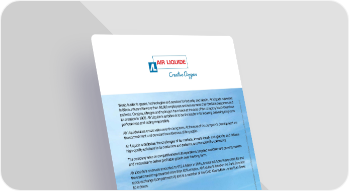 World leader in gases, technologies and services for Industry and Health, Air Liquide is present in 80 countries with more than 50,000 employees and serves more than 2 million customers and patients. Oxygen, nitrogen and hydrogen have been at the core of the company’s activities since its creation in 1902. Air Liquide’s ambition is to be the leader in its industry, delivering long-term performance and acting responsibly. oys - November 2015 T Air Liquide ideas create value over the long term. At the core of the company’s development are the commitment and constant inventiveness of its people. Atteleyn / Air Liquide anticipates the challenges of its markets, invests locally and globally, and delivers high-quality solutions to its customers and patients, and the scientific community. The company relies on competitiveness in its operations, targeted investments in growing markets and innovation to deliver profitable growth over the long-term. Air Liquide’s revenues amounted to €15.4 billion in 2014, and its solutions that protect life and the environment represented more than 40% of sales. Air Liquide is listed on the Paris Euronext stock exchange (compartment A) and is a member of the CAC 40 and Dow Jones Euro Stoxx 50 indexes. echnologies / Jean-Erick Pasquier La Company / P-E Rastoin / Jean-Luc T For any additional information, please contact: Advanced Business and Corporate Communications Air Liquide Caroline Philips +33 (0)1 40 62 50 84 A-pictures / caroline.philips@airliquide.com Meyssonnier CAP A. Anne Michaud +33 (0)1 40 62 50 59 © Photos : anne.michaud@airliquide.com