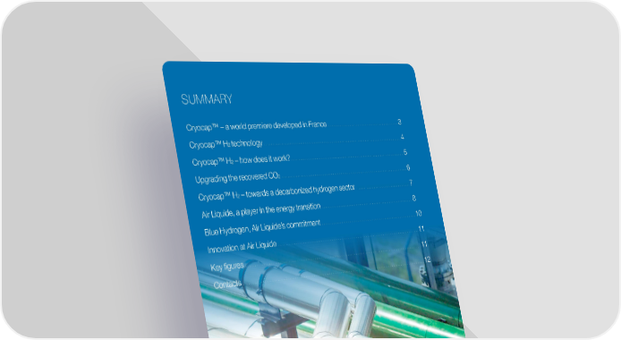 SUMMARY Cryocap™ – a world premiere developed in France ..............................................3 Cryocap™ H technology .....................................................................................4 2 Cryocap™ H – how does it work? .......................................................................5 2 Upgrading the recovered CO ..............................................................................6 2 Cryocap™ H – towards a decarbonized hydrogen sector ..................................7 2 Air Liquide, a player in the energy transition ..........................................................8 Blue Hydrogen, Air Liquide’s commitment ............................................................10 Innovation at Air Liquide .......................................................................................11 Key figures ...........................................................................................................11 Contacts ..............................................................................................................12 2 Cryocap™ Press Kit